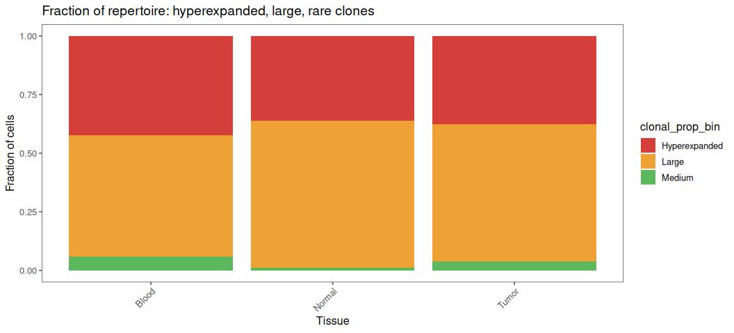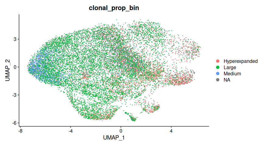 Clonality tells us how overabundant a receptor is inside a repertoire. Here we add a label per receptor, then pass a single label per cell to Seurat for easy plotting on UMAP.