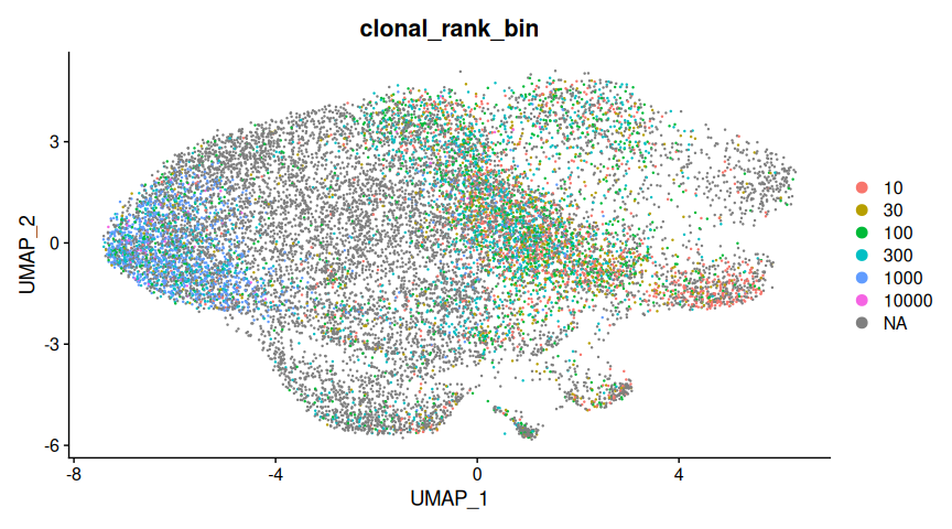 Seurat::DimPlot(sdata, reduction = "umap", group.by = "clonal_rank_bin", shuffle = TRUE)
