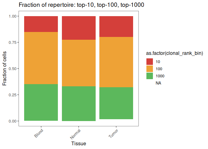 within the repertoire. - By rank: bins by the receptor's rank (top 10, top 100, ...) within the repertoire.