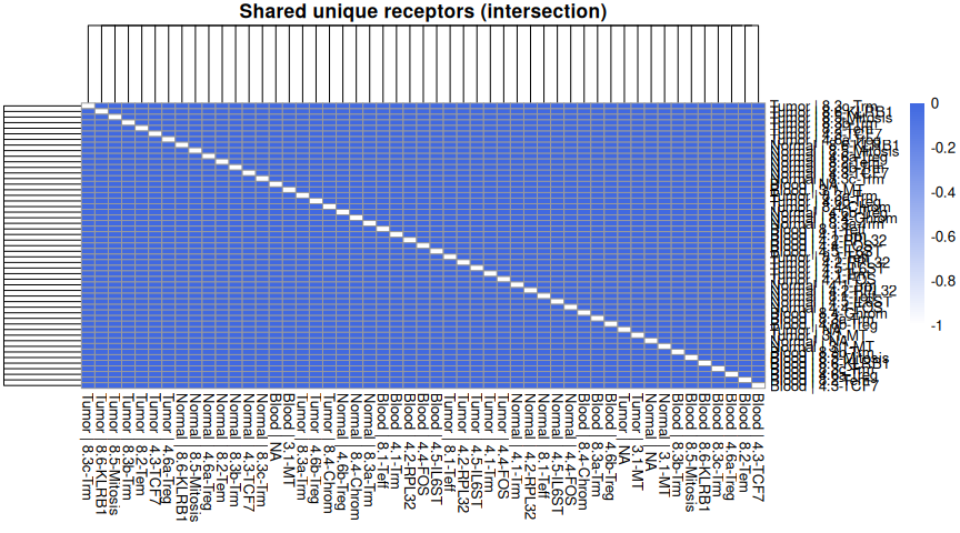 Count of shared unique receptors between each repertoire pair. Use for overlap heatmaps, or to check how much two samples have in common. -