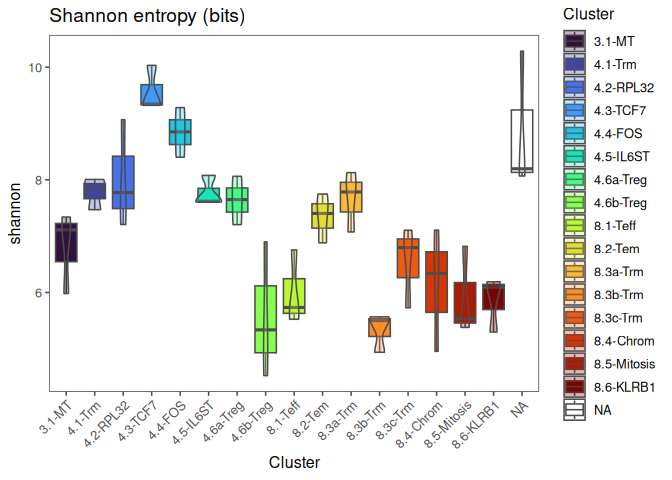 airr_diversity_shannon()Shannon entropy --- a gold standard, evenness-aware metric for diversity. Higher values = more diverse and even repertoire. -
