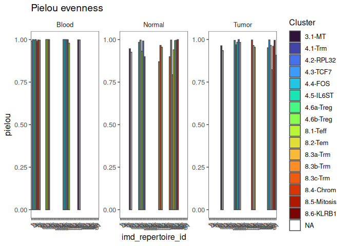 airr_diversity_pielou()Pielou's evenness --- entropy normalized by clone count, ranges [0, 1]. Use when comparing repertoires of very different sizes. -